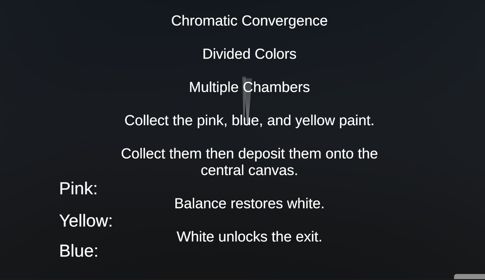 Chromatic Labyrinth is a VR escape room experience developed for the Meta Quest 3 that explores color theory through interactive environmental design. The player begins in a central studio space and must enter separate color-themed rooms to collect isolated pigments while avoiding complementary color hazards. After gathering paint, the player returns to the main studio where they physically grab and throw paint at a central canvas. As more pigment is applied, the canvas gradually shifts toward white, symbolizing balance and harmony. The project emphasizes immersive interaction through XR controller tracking, physics-based grabbing and throwing, trigger and collider systems, world-space 3D UI, and persistent game state management. A GameManager script maintains player inventory across scene transitions, and environmental storytelling is conveyed through spatial layout, lighting, and color relationships rather than explicit narration. Developing the experience required careful coordination between physics systems, scene loading, and XR interaction components, particularly ensuring stable collider configurations for reliable gameplay on the Quest hardware. Through this process, I gained a deeper understanding of VR interaction design, the importance of simplifying systems under time constraints, and the value of testing directly on target devices. With further refinement, I would expand visual effects for paint application, enhance lighting transitions, and deepen narrative elements to create a more polished and immersive experience.